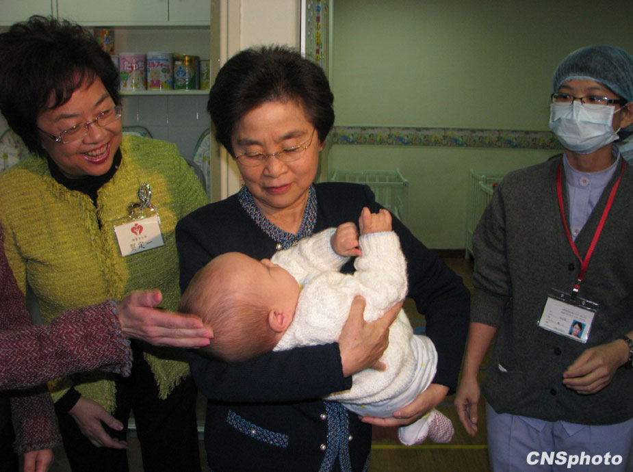 12月19日下午,國(guó)家主席胡錦濤的夫人劉永清參觀澳門(mén)母親會(huì)托兒所時(shí),抱起一名不足一歲的嬰兒。中新社發(fā) 于晶波 攝