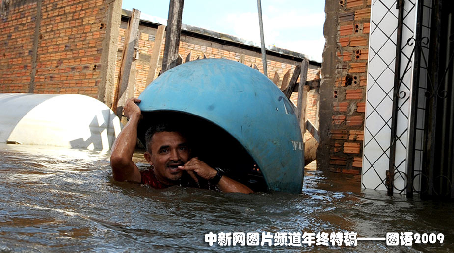 2009年5月11日,一位巴西民眾在洪水中模仿打電話求救的樣子。