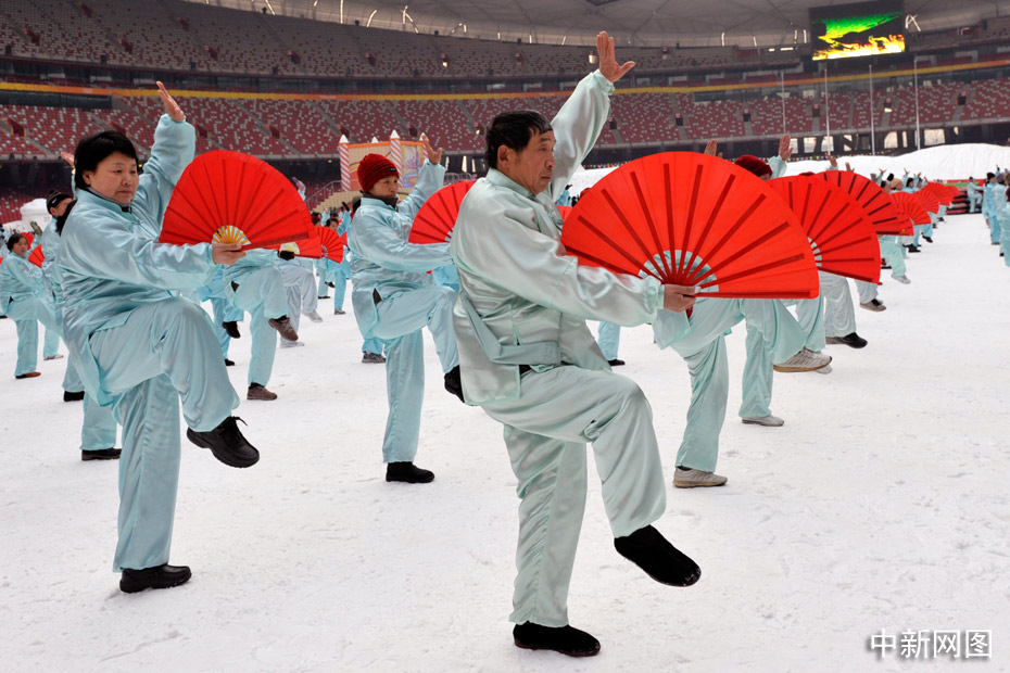 2010年1月1日上午,2010人在被冰雪覆蓋的鳥巢內(nèi)表演了太極拳、武功扇等民族傳統(tǒng)健身項(xiàng)目。中新網(wǎng)記者 金碩 攝