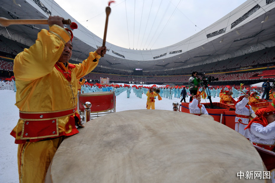 2010年1月1日上午,2010人在被冰雪覆蓋的鳥巢內(nèi)表演了太極拳、武功扇等民族傳統(tǒng)健身項目。中新網(wǎng)記者 金碩 攝
