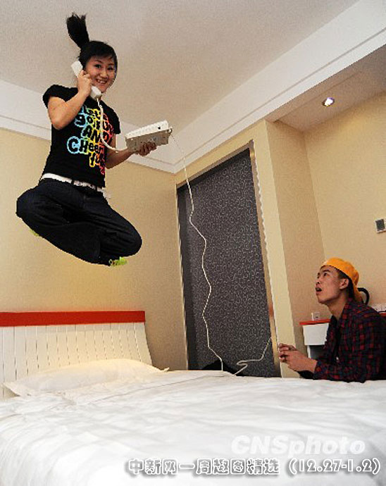 2009年12月26日,山東濰坊年輕人在濰坊一家酒店玩“跳床”。每當(dāng)周末,山東濰坊“跳床”愛好者就聚集起來玩“跳床”游戲,鍛煉身體,減輕工作壓力。據(jù)活動組織者濰坊領(lǐng)航文化負責(zé)人孫志達講,“跳床”從國外流傳而來,能達到鍛煉和減壓效果。目前,在國內(nèi)一些城市,“跳床”受到了越來越多人的歡迎。圖片來源:中國新聞網(wǎng)>>點擊觀看詳細內(nèi)容