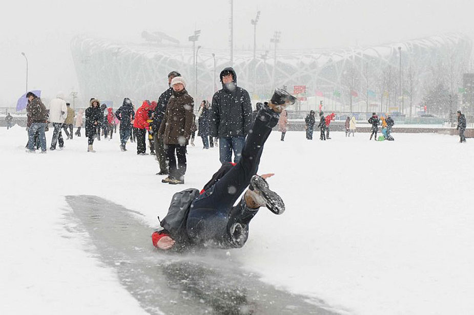 1月3日,鳥巢外的河面,游客在露出冰面玩耍,摔跤連連。周民/CFP