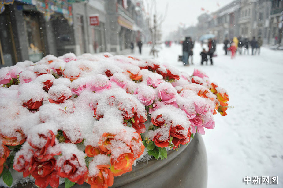 1月3日,北京前門地區(qū)的裝飾花上落滿雪花。中新網(wǎng)記者 金碩 攝