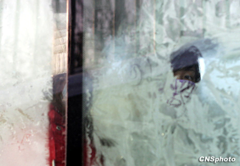 1月4日,大雪之后,北京終于放晴,隨之而來的是大風(fēng)降溫天氣。北京白天最高氣溫降至零下九攝氏度,成為近50年以來的最冷天。圖為公交車窗上凝結(jié)了厚厚的冰花。中新社發(fā) 劉震 攝。