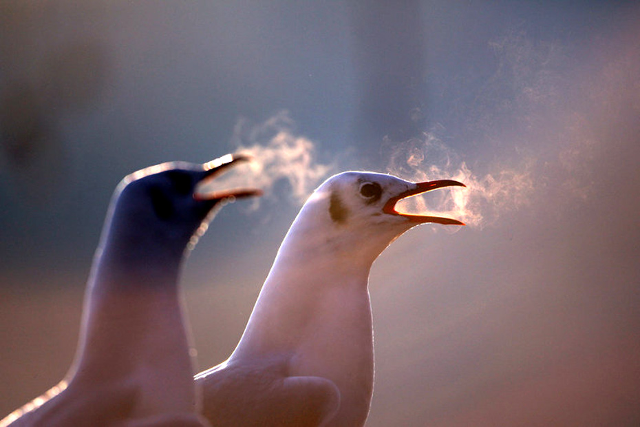 1月4日,倫敦,天氣嚴(yán)寒,兩只海鷗在呼氣。