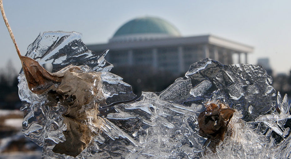 1月3日,首爾,天氣寒冷,隔著冰柱看到的韓國國會(huì)大廈。