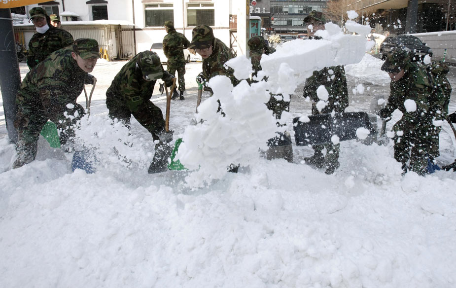 四日,韓國大部分地區(qū)遭遇大雪。至下午二時左右,首爾地區(qū)積雪厚度超過二十八厘米,這是韓國自一九三七年開始進行積雪量觀測以來的最新紀錄。圖為1月5日,韓國士兵在街頭除雪。