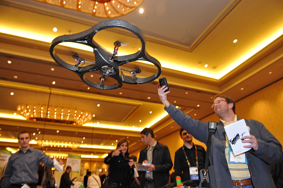 圖為國際消費(fèi)電子展上展示無人駕駛直升機(jī)模型。