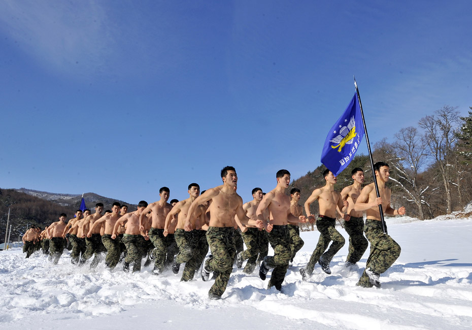 2010年1月8日,韓國特種部隊(duì)在首爾以東約180公里的雪地上進(jìn)行了冬季實(shí)地演練,官兵們赤膊上陣鍛煉耐寒能力。圖片來源:中國新聞網(wǎng)