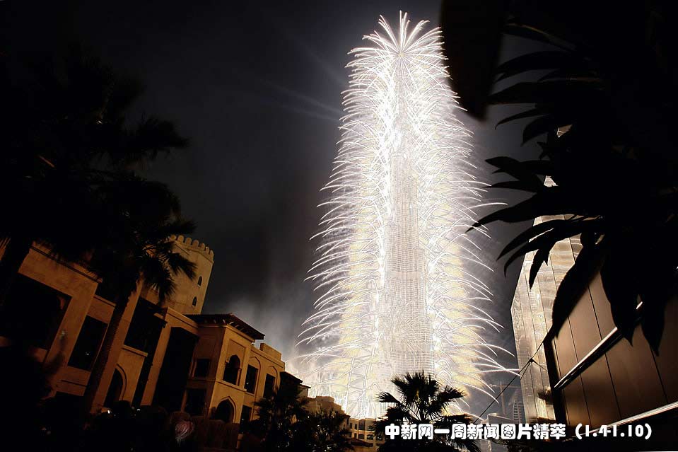 1月4日(周一),世界第一高塔“哈利法塔”(Burj Khalifa)在迪拜揭幕,揭幕典禮上煙花綻放。這座塔高2,717英尺(約合828米),造價(jià)為15億美元。圖片來源:中國新聞網(wǎng)