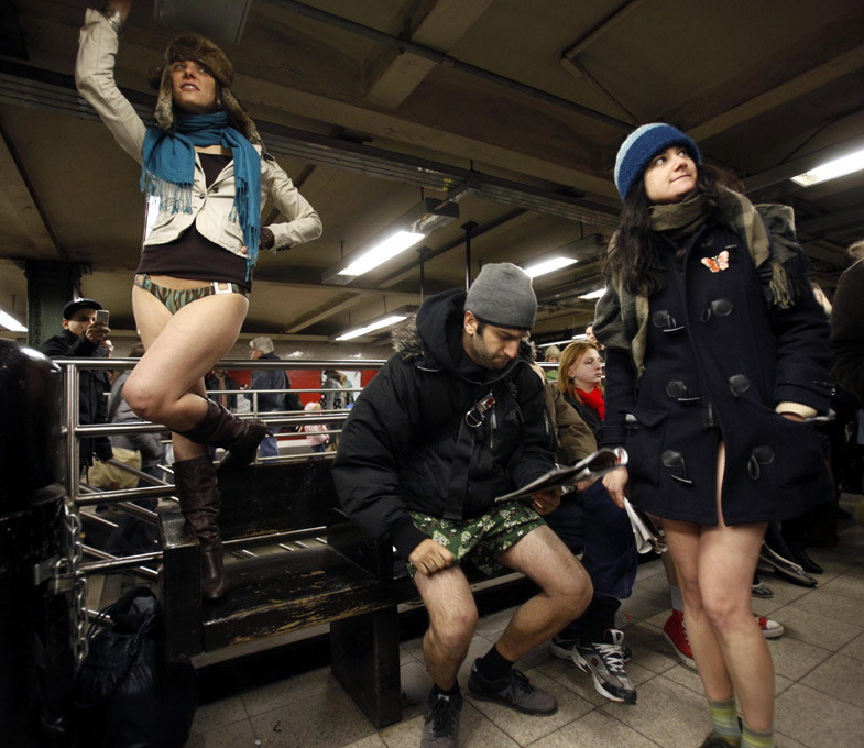 2010年1月10日,紐約,地鐵里一群不穿褲子的乘客。第9屆“不穿褲子乘地鐵”活動(dòng)當(dāng)日在全球16個(gè)國家的44座城市舉行。圖片來源:中國新聞網(wǎng)