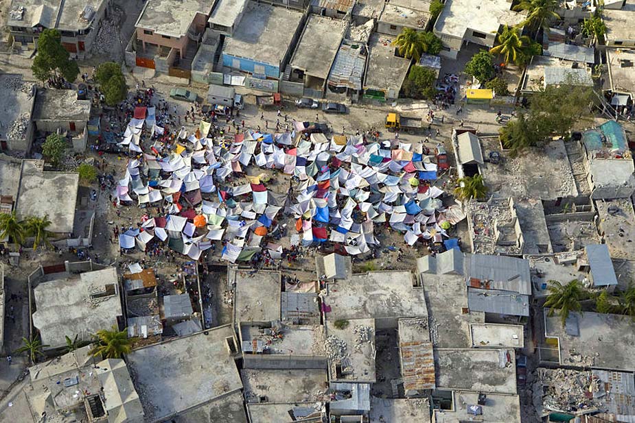 2010年1月13日,海地地震第二天,航拍震后太子港。臨時帳篷。