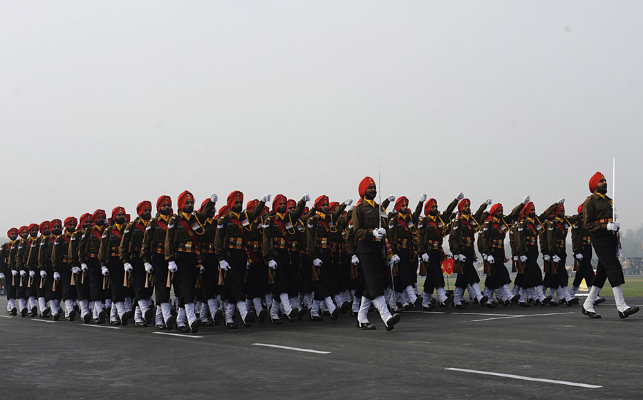 1月15日,在印度首都新德里舉行的建軍節(jié)閱兵式上,印度士兵接受檢閱。圖片來源:中國(guó)新聞網(wǎng)
