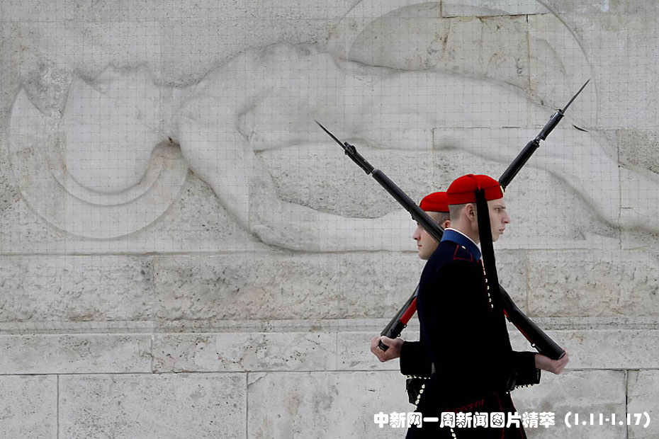 1月11日(周一),在雅典議會(huì)外,總統(tǒng)護(hù)衛(wèi)們進(jìn)行換崗交接儀式。希臘總統(tǒng)帕普利亞斯(Karolos Papoulias)向三名護(hù)衛(wèi)致謝,他們在上周六接到炸彈警報(bào)后堅(jiān)守崗位。此事造成的破壞不大,無人受傷。圖片來源:中國新聞網(wǎng)