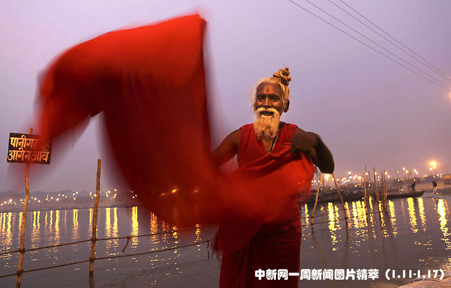 1月13日(周三),在印度阿拉哈巴德一年一度的佛浴節(jié)(Magh Mela)期間,一名印度教信徒在恒河沐浴后晾干衣服。圖片來源:中國新聞網(wǎng)