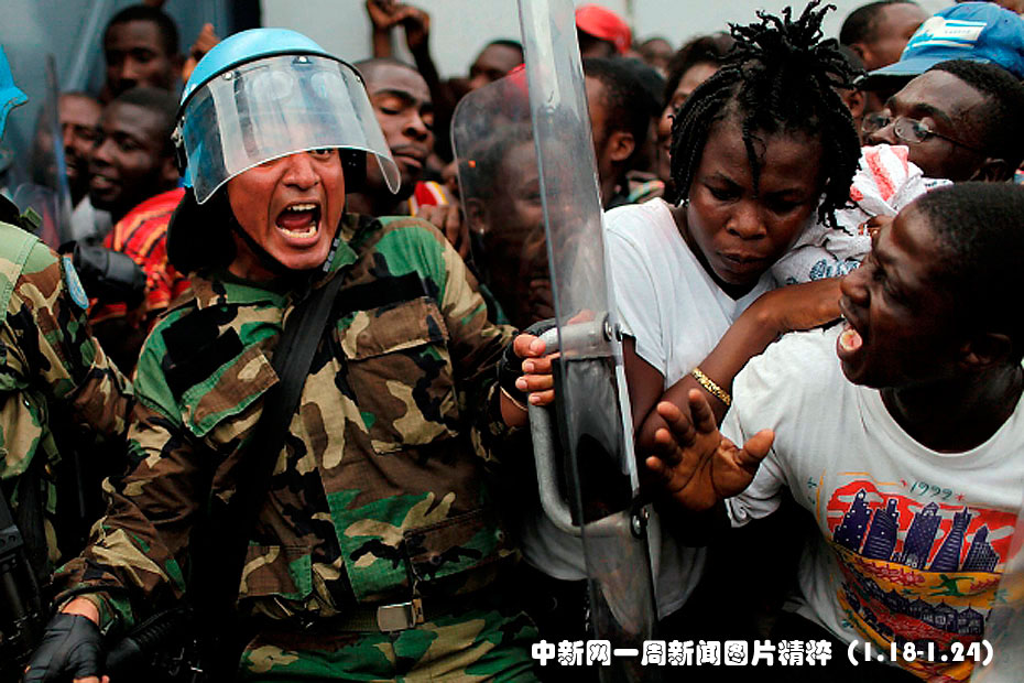 1月19日,在海地太子港,一名秘魯維和人員在試圖控制食品發(fā)放過程中混亂的人群時發(fā)出尖叫。圖片來源:中國新聞網(wǎng)