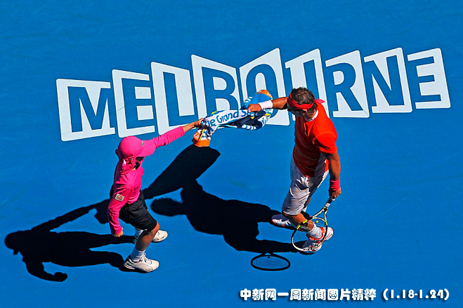 1月20日,在于墨爾本舉行的澳大利亞網(wǎng)球公開賽上,西班牙球手納達(dá)爾在對陣斯洛伐克球手拉科的比賽中從球童手中接過毛巾。納達(dá)爾最終擊敗拉科晉級(jí)。圖片來源:中國新聞網(wǎng)