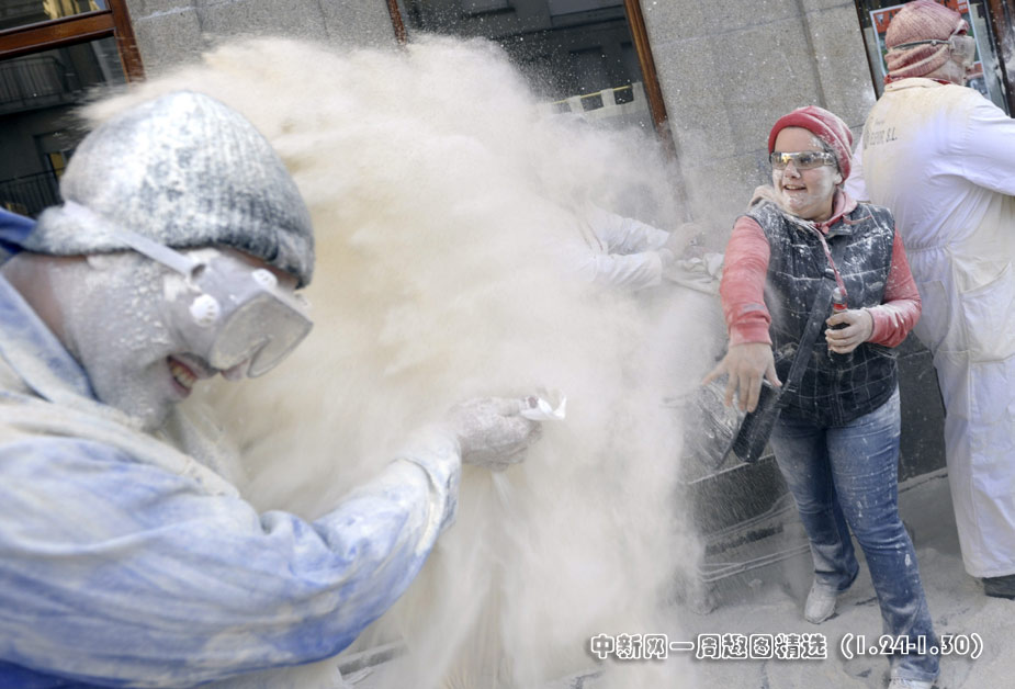 1月24日,西班牙西北部的一座村莊舉辦的狂歡節(jié)中上演瘋狂的“面粉大戰(zhàn)”。 圖片來源:中國新聞網(wǎng)>>點擊觀看詳細(xì)內(nèi)容