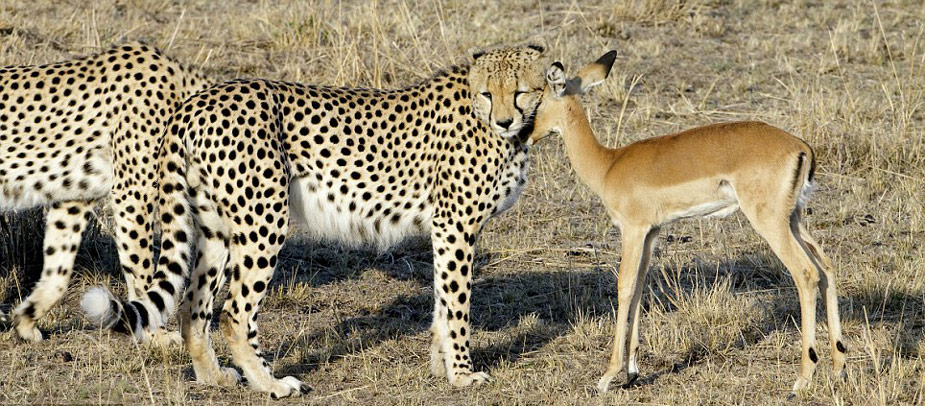 據(jù)英國媒體28日報道,一名在肯尼亞野生動物保護(hù)區(qū)拍照的攝影師拍到令人驚訝的畫面:三只獵豹與一只本是其獵物的小羚羊竟然和睦相處,共同嬉戲玩鬧,完全沒有危險“天敵”的概念。小羚羊最終毫發(fā)無傷地逃生成功。