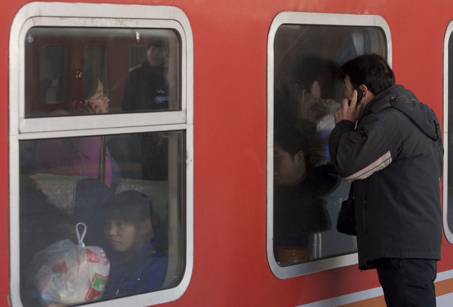 一年一度的春運今日起正式開始。2010年的春運從1月30日起至3月10日,為期40天,其中節(jié)前15天,節(jié)后25天。據(jù)權(quán)威預測,今年春運客運量料超25億人次。圖為一個男子在和已經(jīng)上了車的女朋友打電話,囑咐她看好行李。吳家翔 攝