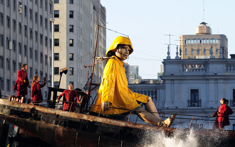 近日,智利首都圣地亞哥街頭,法國(guó)一劇團(tuán)攜巨型提線木偶“小巨人”上街表演,它惟妙惟肖的表情和逼真的神態(tài)引得周圍觀眾的陣陣掌聲。圖片來(lái)源:中國(guó)新聞網(wǎng)
