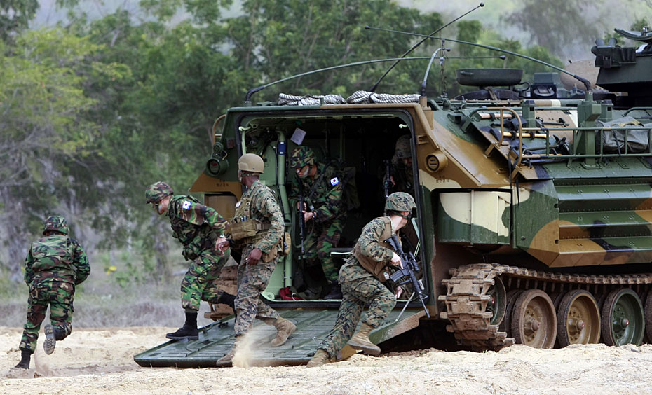 2月4日,參加“金色眼鏡蛇”聯(lián)合軍演的各國軍隊,在泰國的Rayong省沙灘進行了兩棲登陸演練。本次聯(lián)合軍演共有來自泰國、美國、印度尼西亞、新加坡、日本、韓國的約1.4萬名軍人參加。圖片來源:中國新聞網(wǎng)