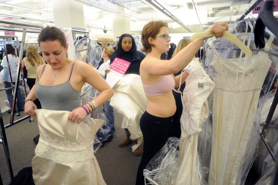 近日,美國紐約一年一度的“新娘快跑”婚紗促銷活動舉行。千余名來自全美各地的準新娘和親朋好友,早早就在門口等候,平時上千美元婚紗只需要五分之一的價格就能帶回家。圖片來源:中國新聞網(wǎng)