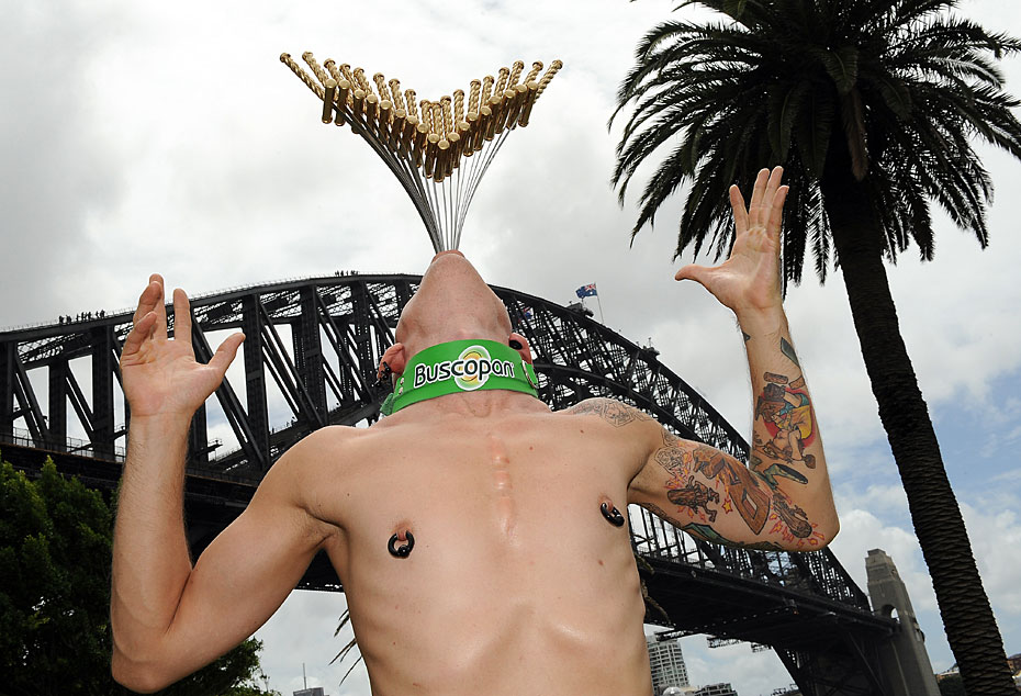 2月8日,街頭藝人Chayne Hultgren在澳大利亞悉尼海港大橋前,一次吞下18把厚約1.3厘米,長約50.8厘米的長劍,刷新了吉尼斯世界紀(jì)錄。圖片來源:中國新聞網(wǎng)