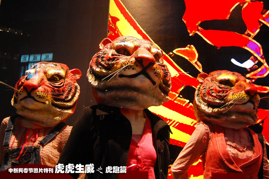 1月31日,上海市西藏中路的一家商店櫥窗中,服裝模特的頭變成了老虎頭,商家以“虎哥虎姐”吸引顧客前往購物。隨著春節(jié)的臨近,各大商家紛紛推出各類“虎年促銷”,吸引顧客消費。中新社發(fā) 許康平 攝