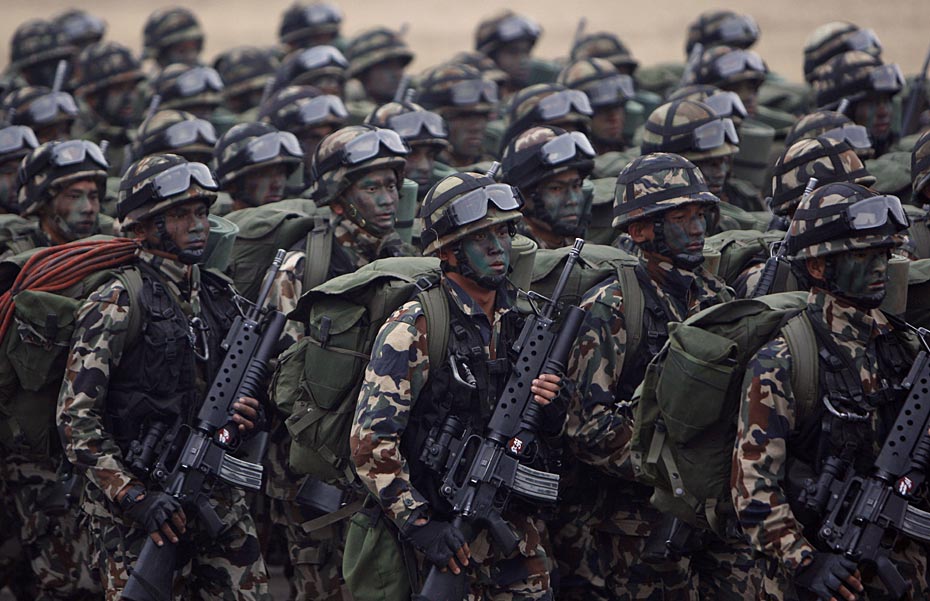 當?shù)貢r間2月12日,尼泊爾士兵在首都加德滿都舉行了建軍節(jié)閱兵式。尼泊爾總統(tǒng)和總參謀長檢閱了受閱部隊。圖片來源:中國新聞網(wǎng)