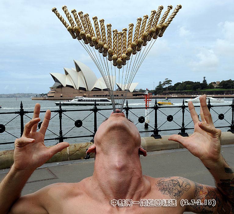 2月8日,街頭藝人Chayne Hultgren在澳大利亞悉尼海港大橋前,一次吞下18把厚約1.3厘米,長約50.8厘米的長劍,刷新了吉尼斯世界紀(jì)錄。圖片來源:中國新聞網(wǎng)>>點擊觀看詳細(xì)內(nèi)容