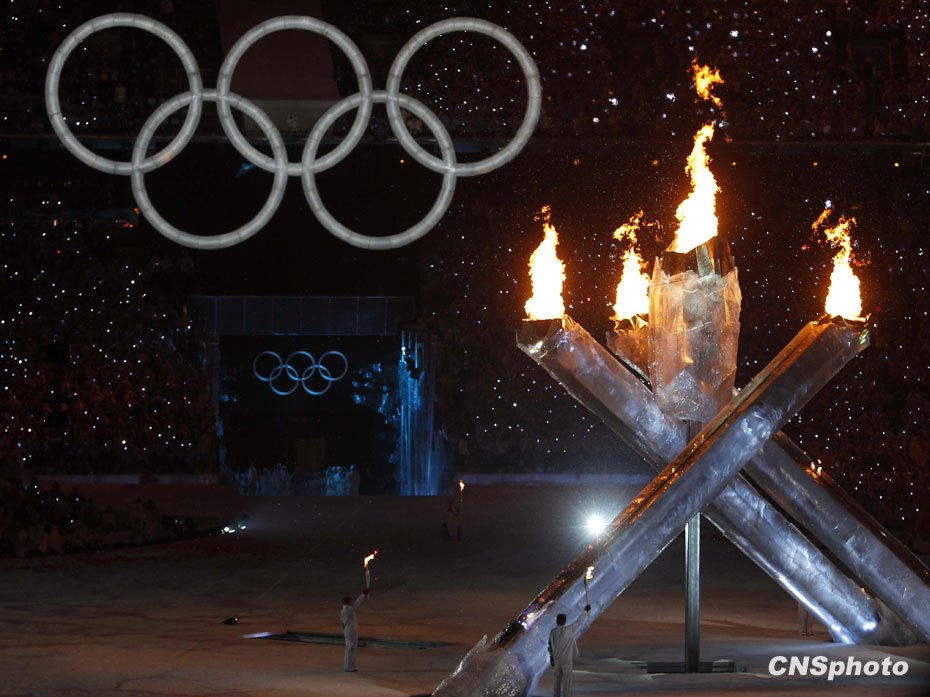 圖為溫哥華冬奧會(huì)主火炬在體育館內(nèi)點(diǎn)燃。