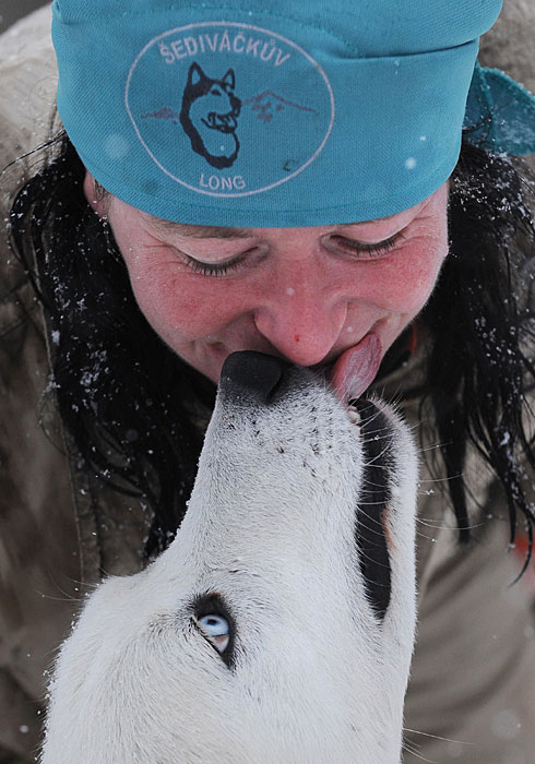 圖為奧地利山區(qū)的雪橇狗在親吻主人。圖片來源:中國新聞網(wǎng)
