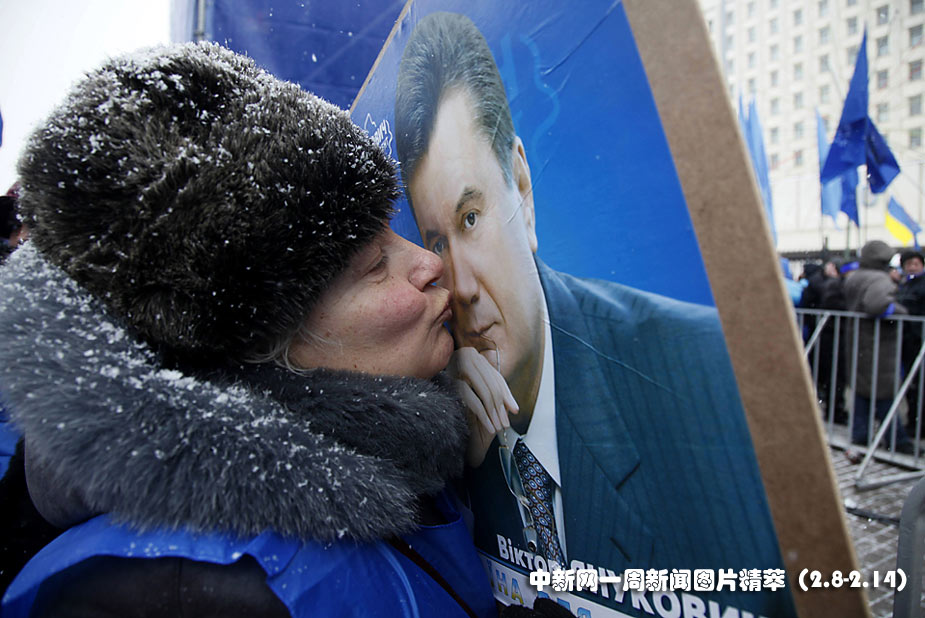 周一(8日)烏克蘭反對黨領(lǐng)袖、總統(tǒng)候選人亞努科維奇(Viktor Yanukovych)的支持者在基輔的一個集會上,親吻亞努科維奇的海報。大部分選票結(jié)果顯示,亞努科維奇在上周日的大選中戰(zhàn)勝了總理季莫申科。