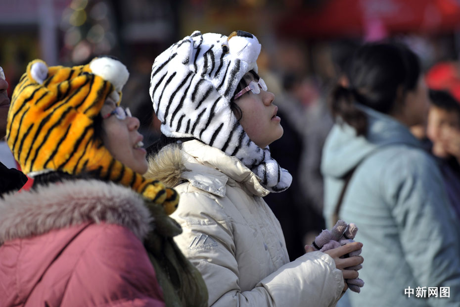 2月14日,農(nóng)歷正月初一,北京各大傳統(tǒng)廟會、洋廟會爭相開幕,許多游客頭戴虎年飾品開心游廟會。中新網(wǎng)記者 金碩 攝