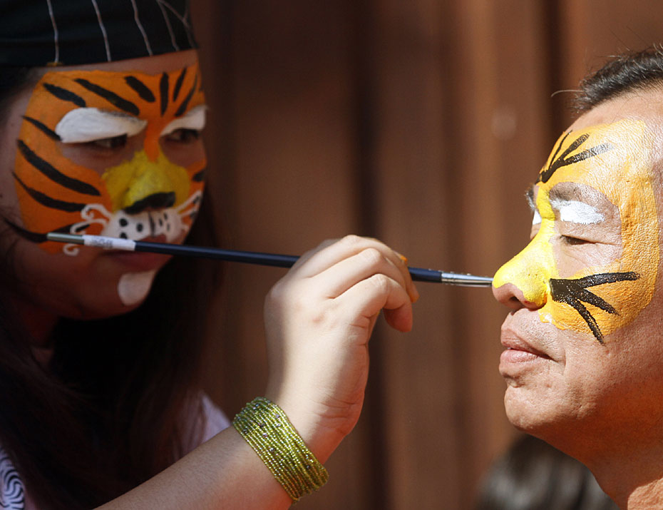 2月20日,馬來西亞民眾圍聚在首都吉隆坡附近的佛光山東禪寺,紛紛將自己繪成老虎的樣子,呼吁大家保護(hù)野生虎。圖片來源:中國(guó)新聞網(wǎng)