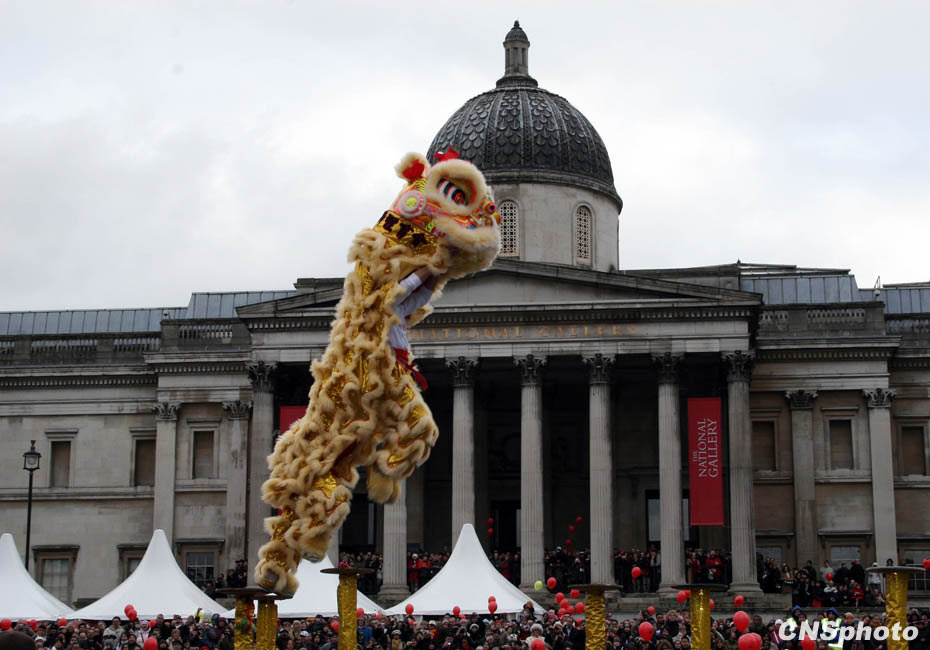 當(dāng)?shù)貢r(shí)間2月21日,亞洲之外最大規(guī)模的春節(jié)慶;顒(dòng)——倫敦春節(jié)慶典在倫敦特拉法加廣場(chǎng)、萊斯特廣場(chǎng)及倫敦華埠舉行,圖為當(dāng)?shù)貎S社舞獅團(tuán)表演的“梅花樁”,令現(xiàn)場(chǎng)數(shù)萬觀眾發(fā)出驚嘆。 中新社發(fā) 魏群 攝