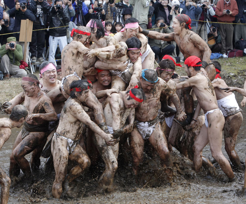 2月25日,在日本千葉縣四街道市郊外的稻田里,居民們參加一年一度的“泥漿節(jié)”。當(dāng)?shù)氐哪凶觽兂嗌硖M稻田,把泥漿涂抹在身上。人們希望通過這種儀式祈求新的一年能有個好收成。