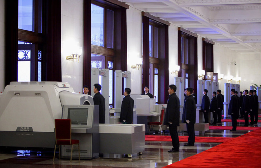 3日下午,全國(guó)政協(xié)十一屆三次會(huì)議將在北京人民大會(huì)堂開(kāi)幕,2010年全國(guó)“兩會(huì)”由此正式揭開(kāi)大幕,目前各項(xiàng)工作準(zhǔn)備就緒。圖為人民大會(huì)堂的主要入口處的安保人員。Feng Li 攝