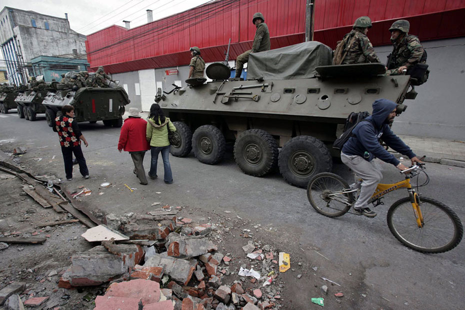 智利總統(tǒng)巴切萊特當(dāng)日說(shuō),政府派往災(zāi)區(qū)維持治安的軍人數(shù)量已達(dá)14000人,地震重災(zāi)區(qū)的搶劫現(xiàn)象已得到控制。圖片來(lái)源:中國(guó)新聞網(wǎng)