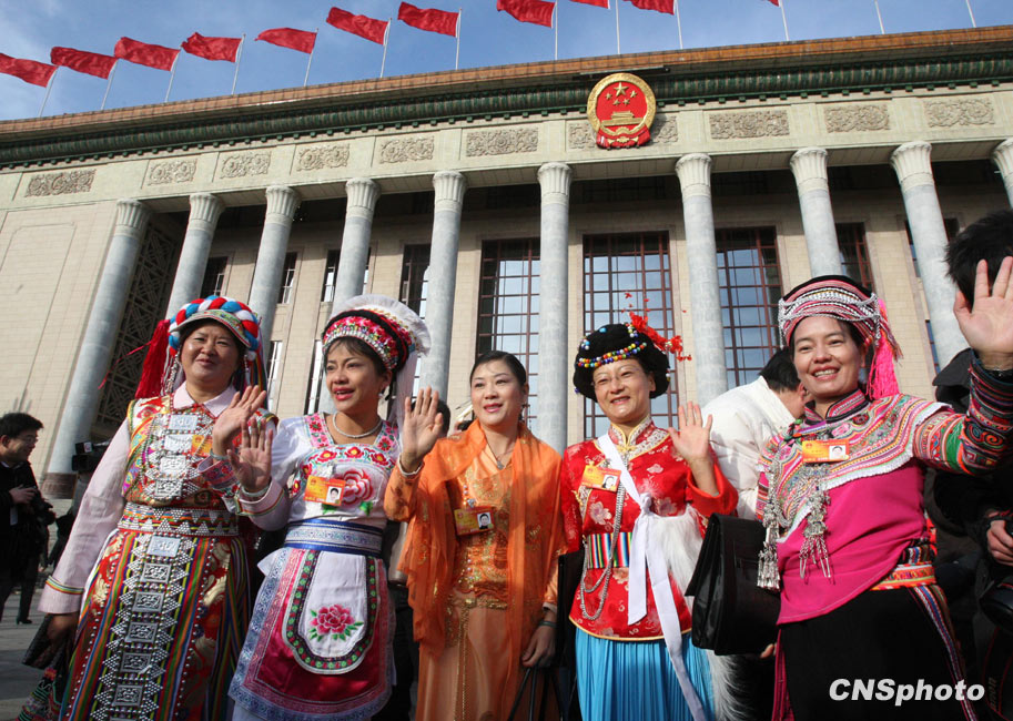 3月5日上午9時,十一屆全國人大三次會議在北京隆重開幕。國務院總理溫家寶作政府工作報告。圖為少數(shù)民族女代表盛裝出席人大開幕會。 中新社發(fā) 湯彥俊 攝