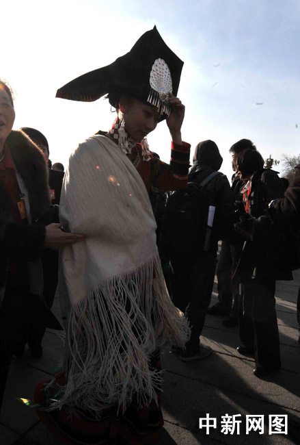 十一屆全國(guó)人大三次會(huì)議3月5日在北京開幕,各民族人大女代表的服飾靚麗多彩,在天安門廣場(chǎng)前大展英姿。 中新社記者 賈國(guó)榮 攝