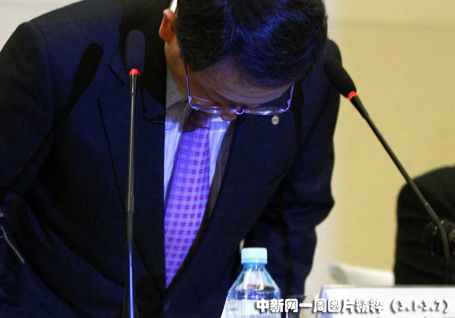 3月1日,豐田汽車總裁豐田章男今日在北京舉行記者會(huì),介紹了豐田汽車大規(guī)模召回的原因及處理措施,并向中國(guó)消費(fèi)者鞠躬道歉。圖片來(lái)源:中國(guó)新聞網(wǎng)