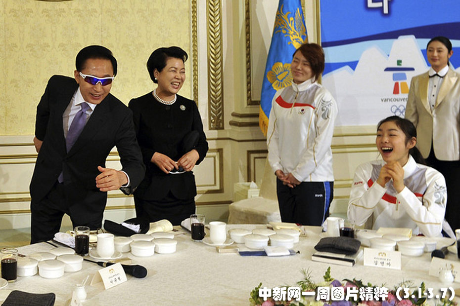 3月3日,韓國總統(tǒng)李明博在接受了韓國滑冰選手李相華(冬奧會(huì)女子500米速滑金牌)和金妍兒(女子花樣滑冰金牌)贈(zèng)送的一副太陽鏡后擺出滑冰選手的造型。圖片來源:中國新聞網(wǎng)