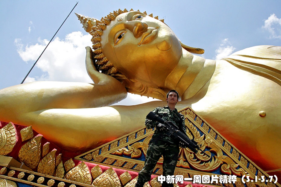 3月4日,在泰國(guó)也拉府的一所寺廟中,一名士兵持槍站在一尊佛像前,確保寺廟在動(dòng)蕩中不受損害。圖片來源:中國(guó)新聞網(wǎng)