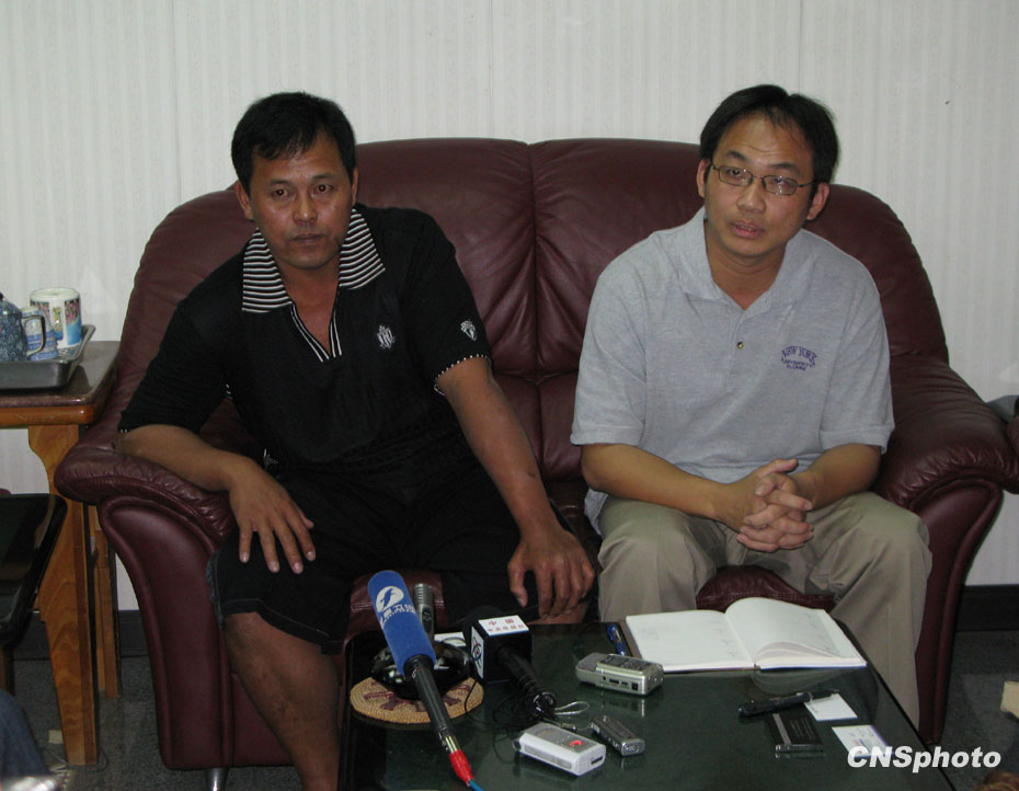 圖為3月6日“穩(wěn)發(fā)161號”船長顏勝男(左)、穩(wěn)發(fā)漁業(yè)公司經理劉銘復(右)在高雄接受大陸記者采訪,他們感謝大陸船東協(xié)會提供及時幫助、海軍提供柴油、伙食和護航。 中新社發(fā) 耿軍 攝