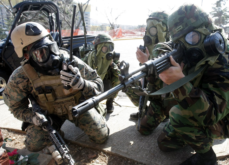 3月11日,在韓國鎮(zhèn)海海軍基地,韓美兩國的海軍陸戰(zhàn)隊舉行了聯(lián)合反恐軍事演習(xí)。