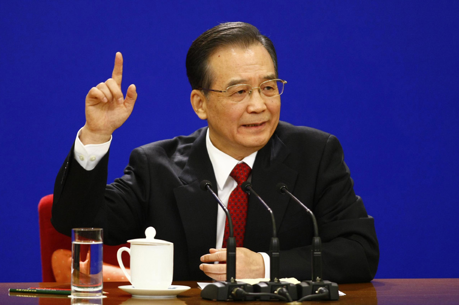 3月14日上午,國務(wù)院總理溫家寶在人民大會堂三樓金色大廳與采訪十一屆全國人大三次會議的中外記者見面并回答記者提出的問題。中新社記者 杜洋 攝 圖片來源:中國新聞網(wǎng)