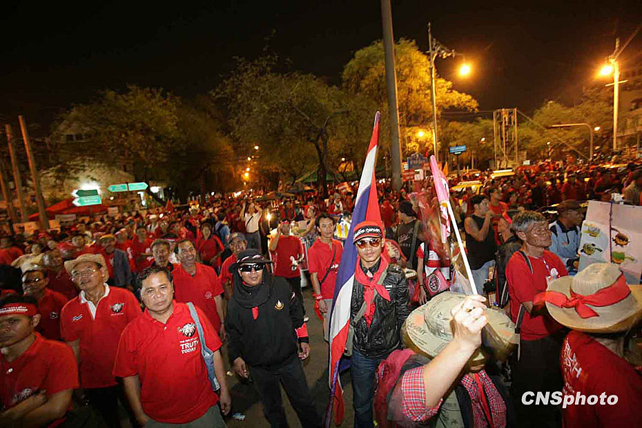 3月13日起,泰國“紅衫軍”陸續(xù)從泰國北部、東北部等外府進入曼谷市,在集會主會場搭設演講舞臺和帳篷,拉開大規(guī)模示威序幕。圖片來源:中國新聞網(wǎng)