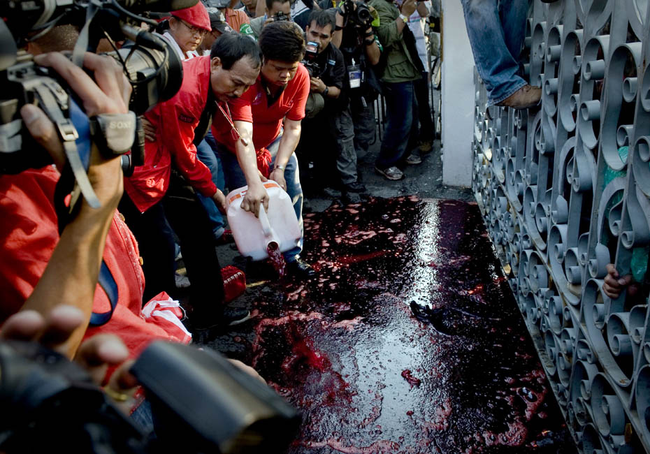 泰國反政府組織“紅衫軍”成員將血液潑灑在曼谷總理府門前,以此向政府施壓要求解散國會下議院。圖片來源:中國新聞網(wǎng)